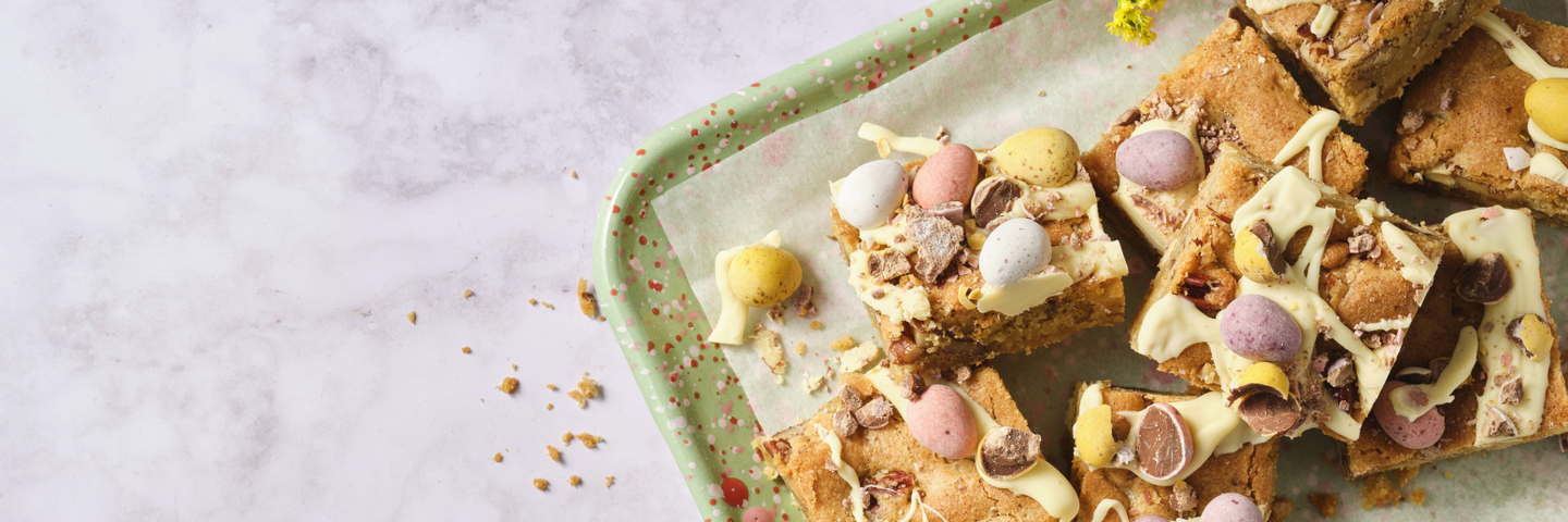 - Cool in the fridge before cutting into squares, then melt the white chocolate and drizzle it over the top. Sprinkle with Mini Eggs to finish